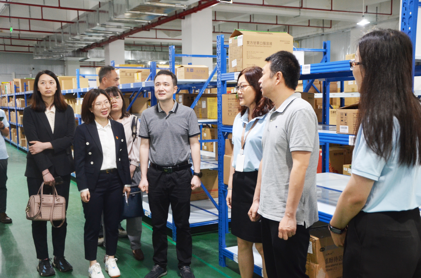 調(diào)研組一行首先深入倉(cāng)庫(kù)現(xiàn)場(chǎng),實(shí)地考察物流倉(cāng)庫(kù),了解倉(cāng)庫(kù)儲(chǔ)存、配送環(huán)節(jié)的整體運(yùn)行情況。隨后,調(diào)研組就調(diào)研項(xiàng)目與華潤(rùn)汕頭康威醫(yī)藥進(jìn)行座談。