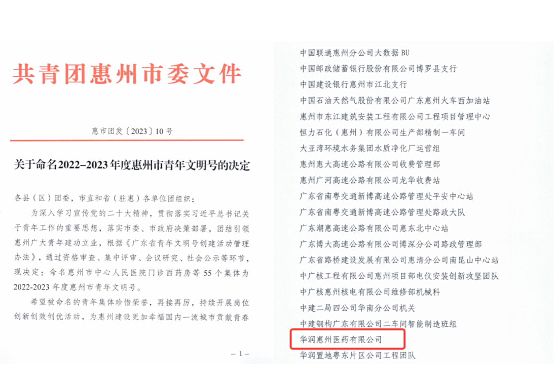 近日,共青團惠州市委印發(fā)《關于命名2022-2023年度惠州市青年文明號的決定》,華潤惠州醫(yī)藥有限公司(以下簡稱“惠州公司”)名列其中。自開展“青年文明號”活動以來,在公司黨組織的領導下,團支部把創(chuàng)建目標、活動項目作為凝聚青年、團結(jié)青年的有效形式,不斷激發(fā)青年職工的積極性、主動性和創(chuàng)造性。